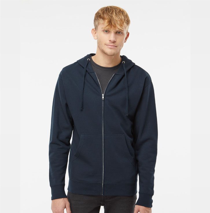Midweight full-zip hoodies made of 80/20 cotton/polyester blende fleece with 100% cotton face, with over 30 colors do choose from. They feature a jersey-lined hood and heavy gauge drawcord with metal eyelets.